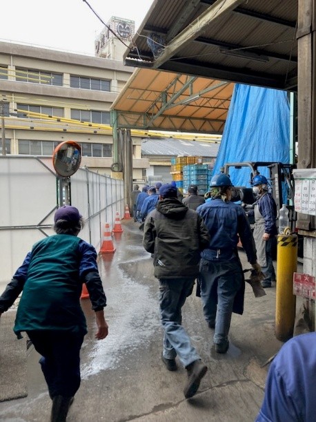| 放送を聞いた従業員が避難ルートを通り、集合場所まで向かいます。 | |||||||